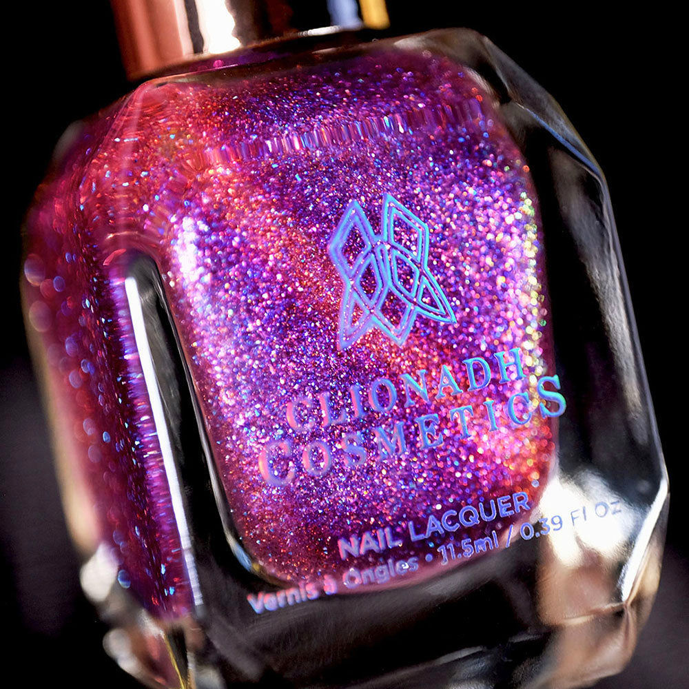 Amorem: A lovesick red magnetic suspended in a potion of indigo-pink shifting medium particle shimmer and pale blue reflective glitter. This is a sibling formula to our popular Electro Slick-adelic nail lacquers.