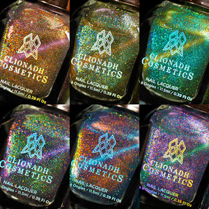 Shock: An orange magnetic nail lacquer that pulls to reveal silvery pink-lime and cyan large particle shimmers with lime reflective glitter.