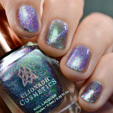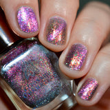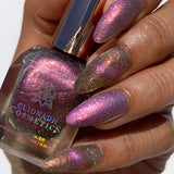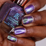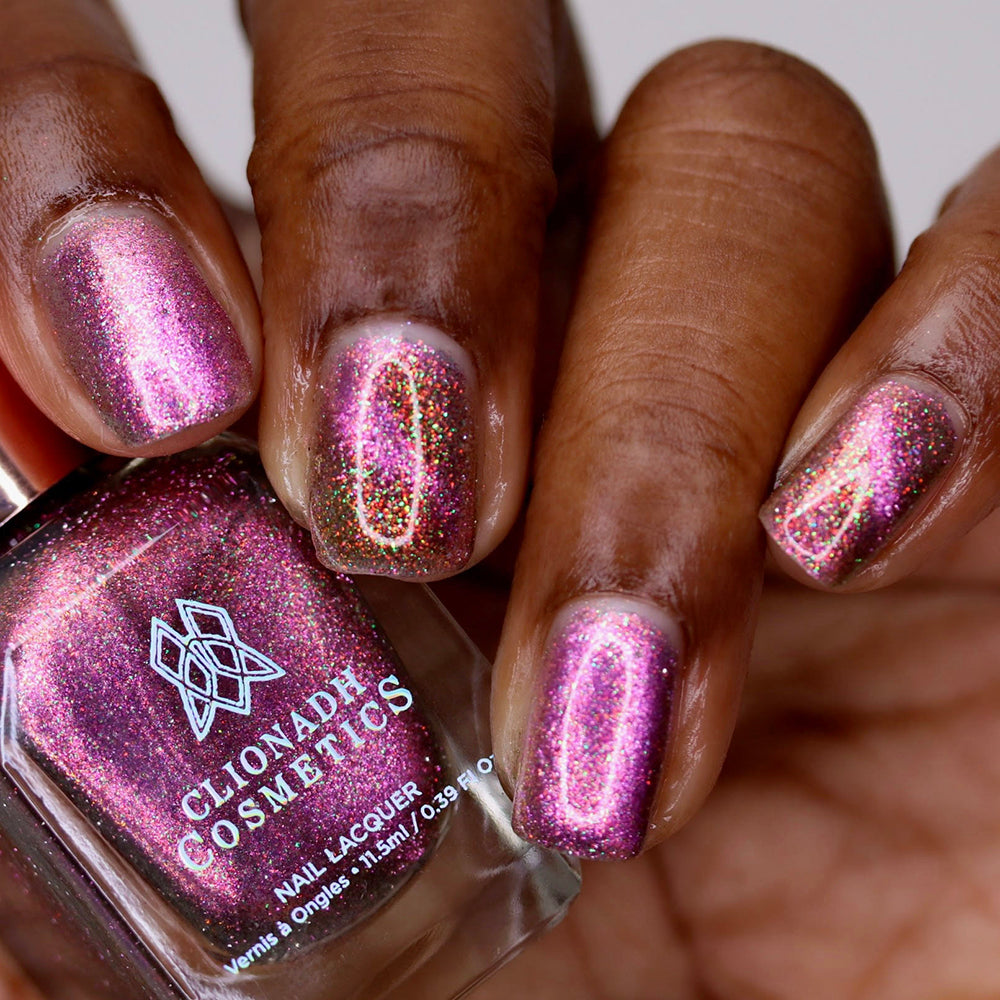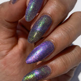 Watt: A purple magnetic nail lacquer that pulls to reveal green-red and yellow large particle shimmers with red reflective glitter.
