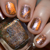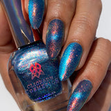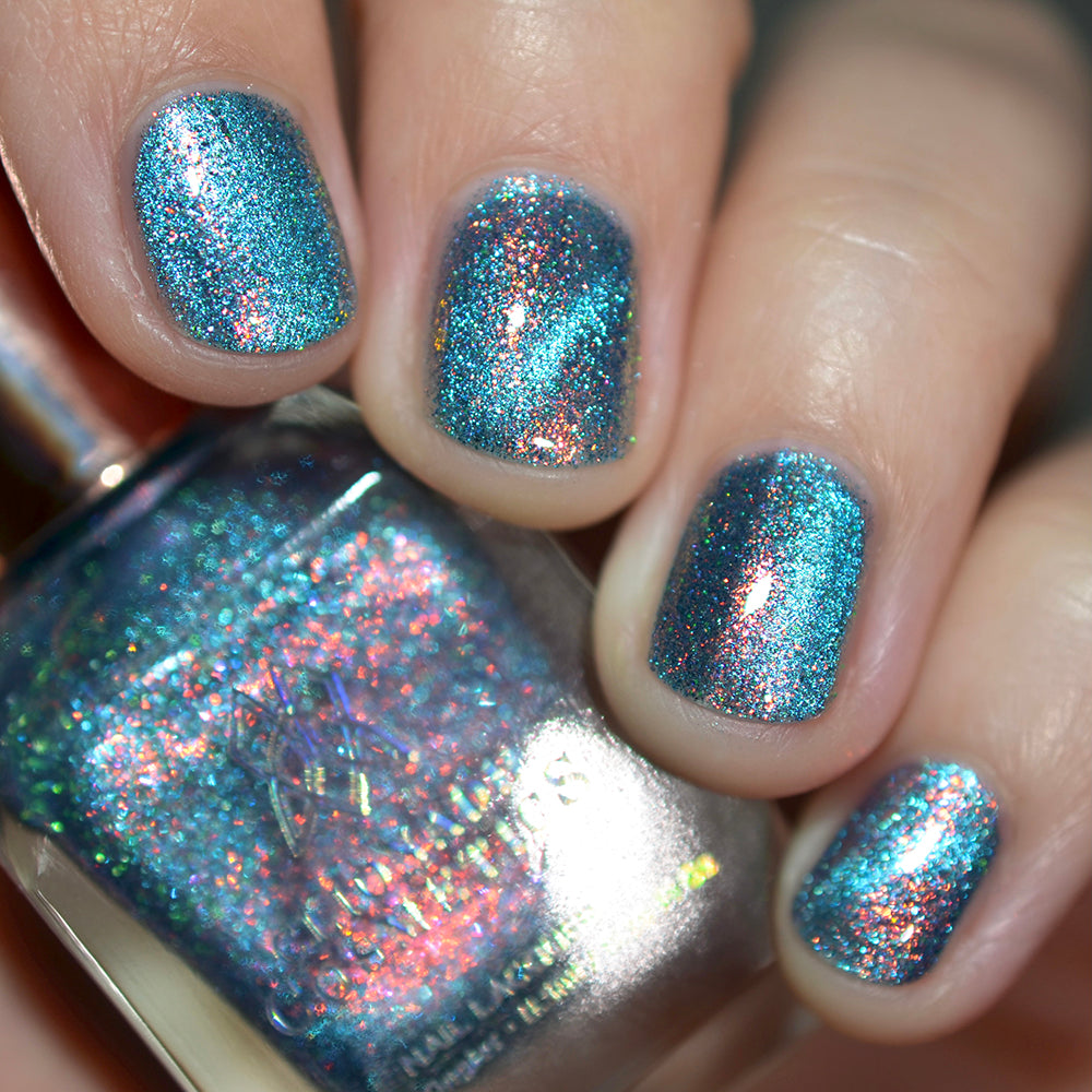 Zap: A cerulean magnetic nail lacquer that pulls to reveal hot orange-yellow-lime large particle shimmers with green reflective glitter.
