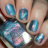Volt: A gold magnetic nail lacquer that pulls to reveal turquoise-blue large particle shimmers with green reflective glitter.