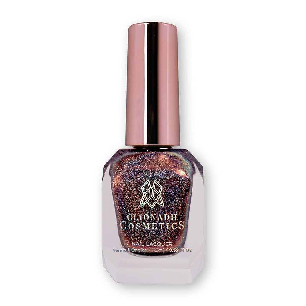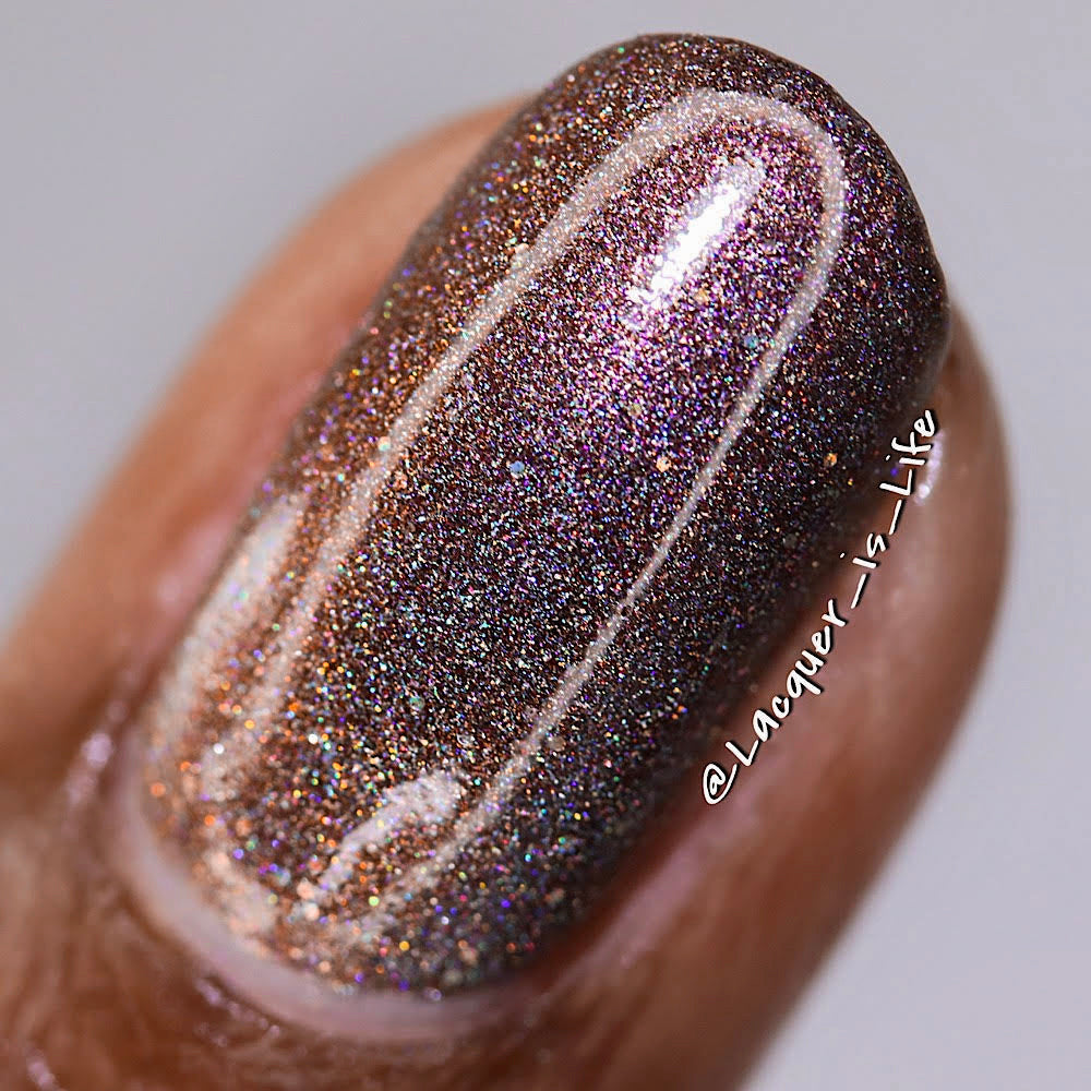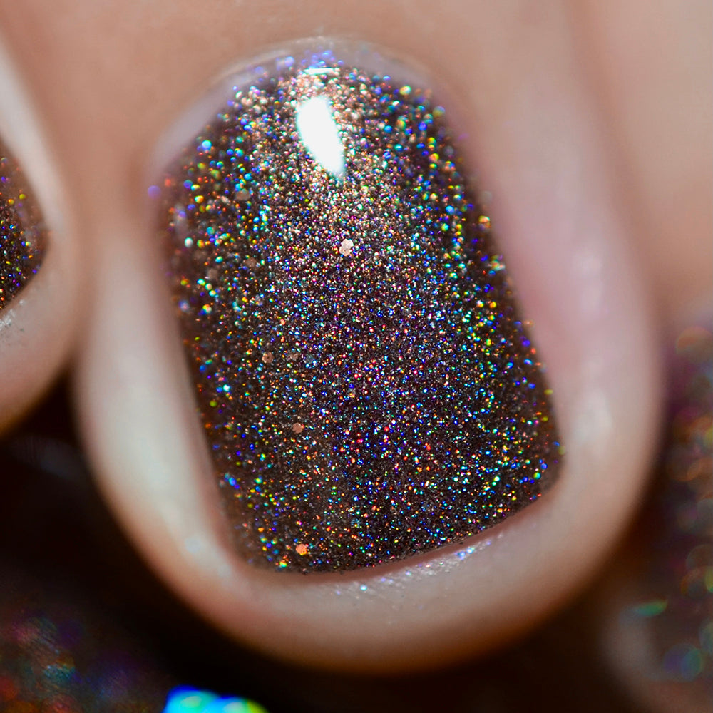 Graveyard: An intense earthen brown linear holographic with scattered holographic glitter and a hellfire orange shift. A resurrection of Graveyard Shift from our 2023 All Hallows' Eve mini nail lacquer set, but without linear holographic flakes.