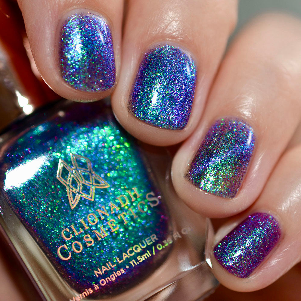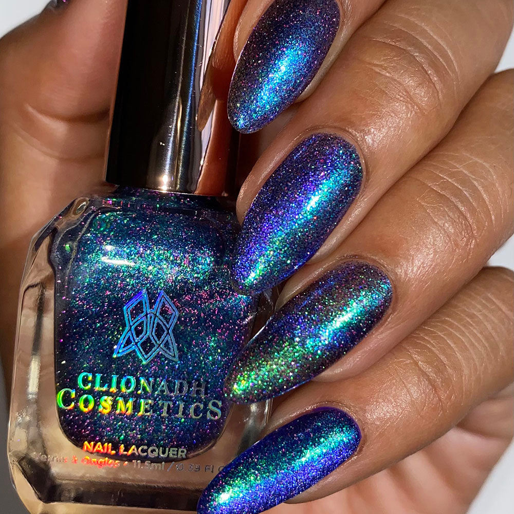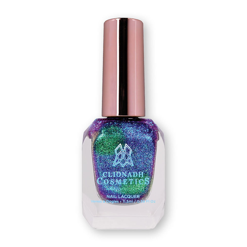 Nocturne: A midnight blue magnetic suspended in a draught of green-blue shifting medium particle shimmer and red reflective glitter. This is a sibling formula to our popular Electro Slick-adelic nail lacquers.