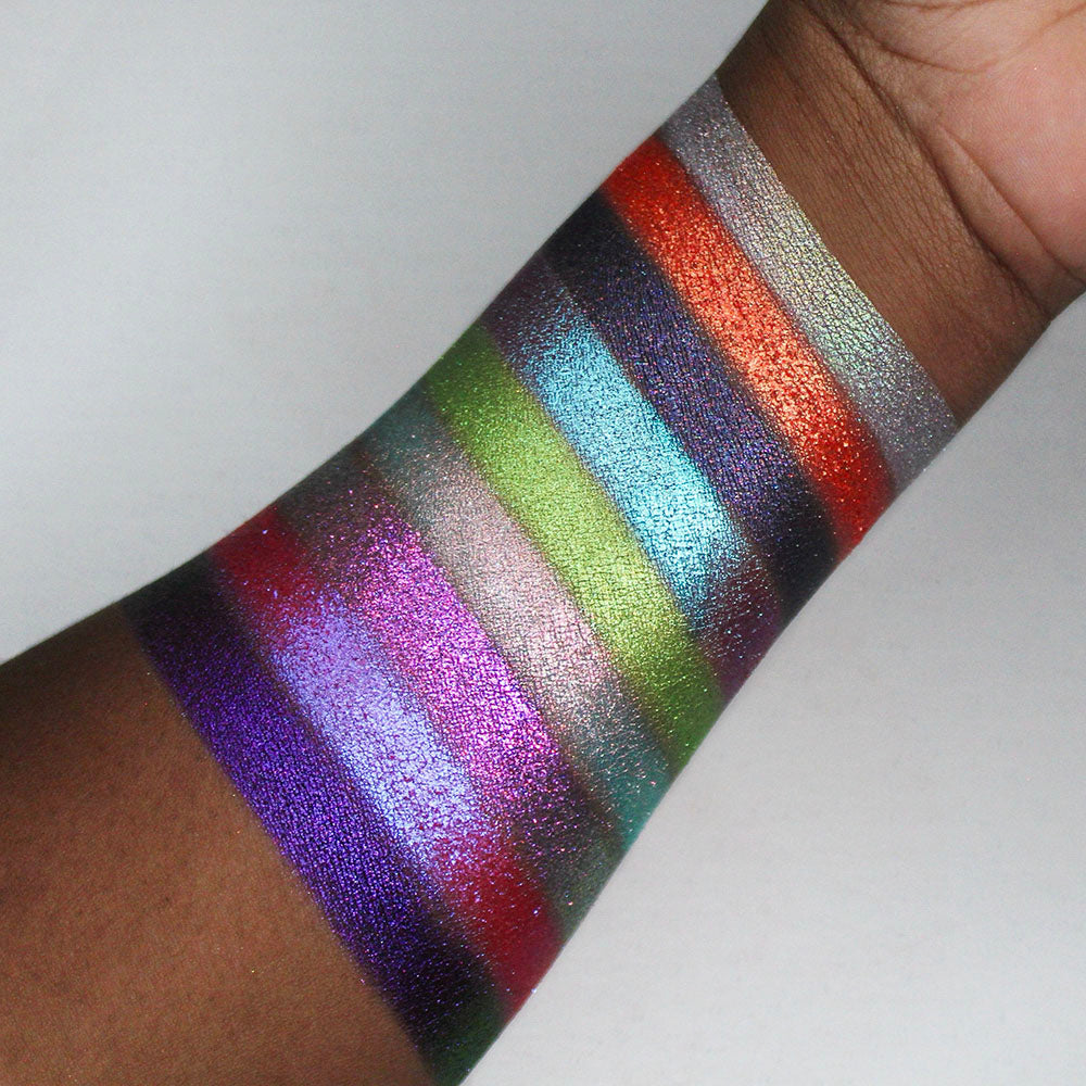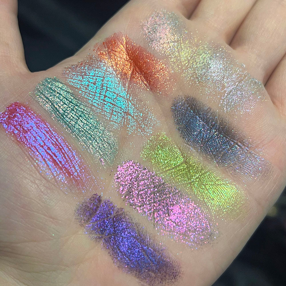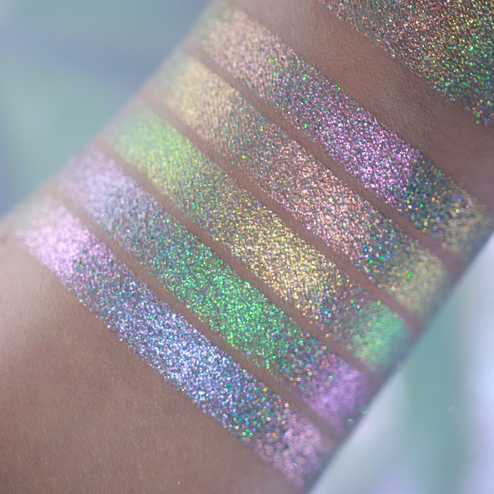 Vials of the Unknown: 5 glittering holographic shadows in a rainbow array.