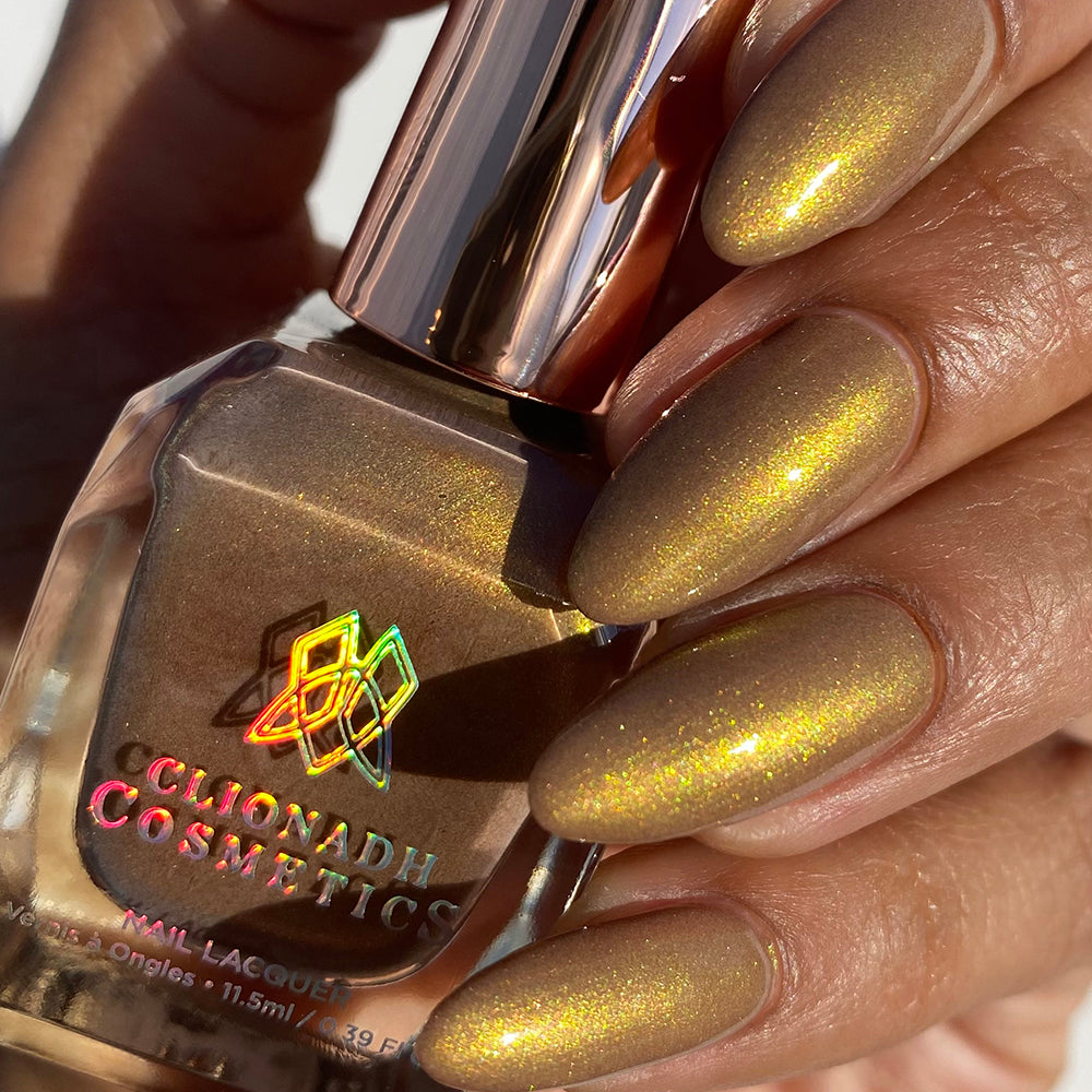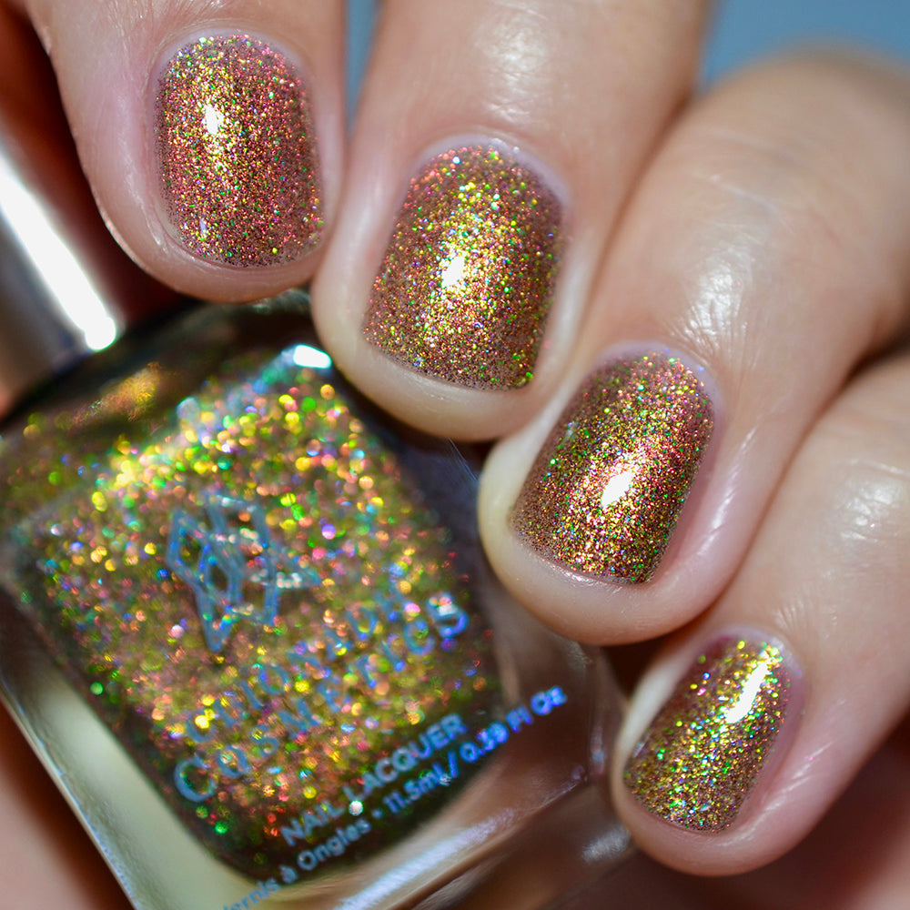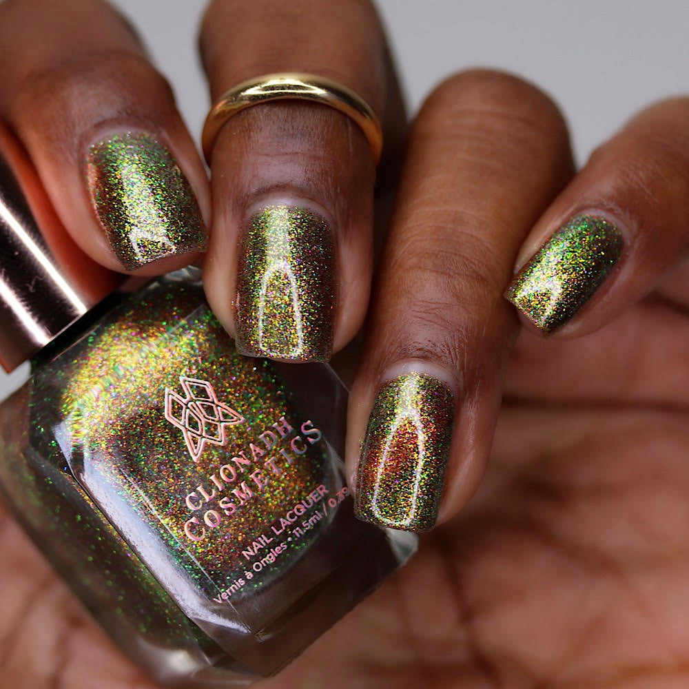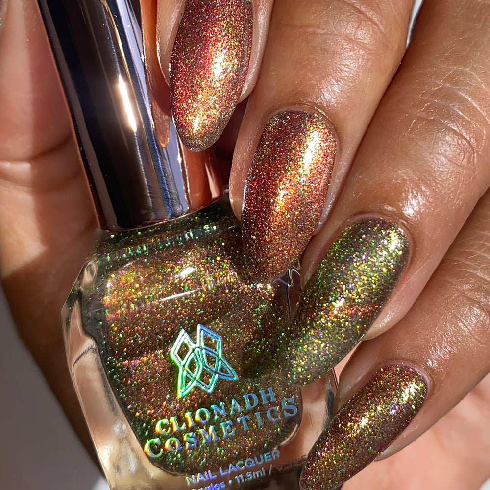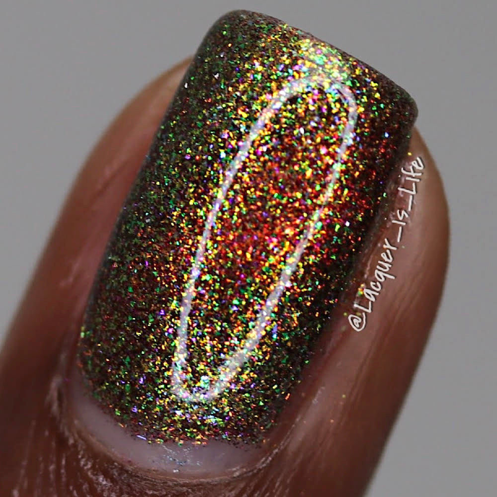 Apple Picking: A ripe red magnetic nail lacquer that pulls to reveal a golden-green shift with lime reflective glitter and hints of rainbow sparkle.