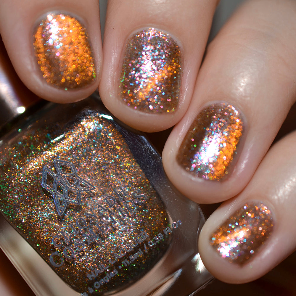 Shock: An orange magnetic nail lacquer that pulls to reveal silvery pink-lime and cyan large particle shimmers with lime reflective glitter.
