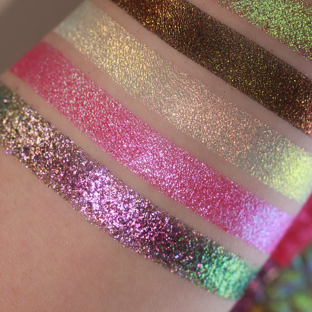 A magenta to peach to yellow to lime shift with multicolour glitters throughout.