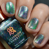 Amp: An emerald green magnetic nail lacquer that pulls to reveal red-yellow and blue large particle shimmers with pink reflective glitter.