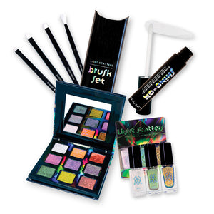 This bundle includes: the Light Scatters Multichromatic Palette, the Shine-on Shimmer Shadow Enhancer, the Light Scatters Mini Nail Lacquer Trio, and the Light Scatter 4-Piece Brush Set.