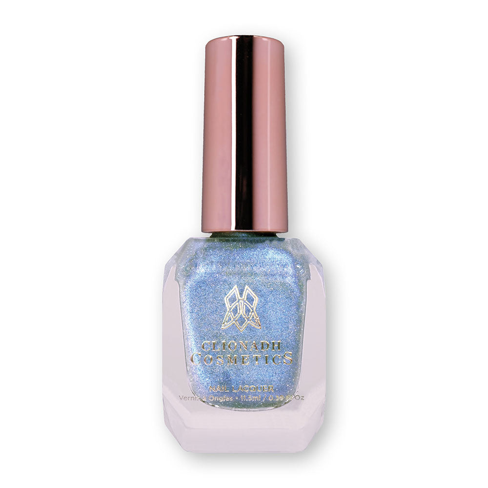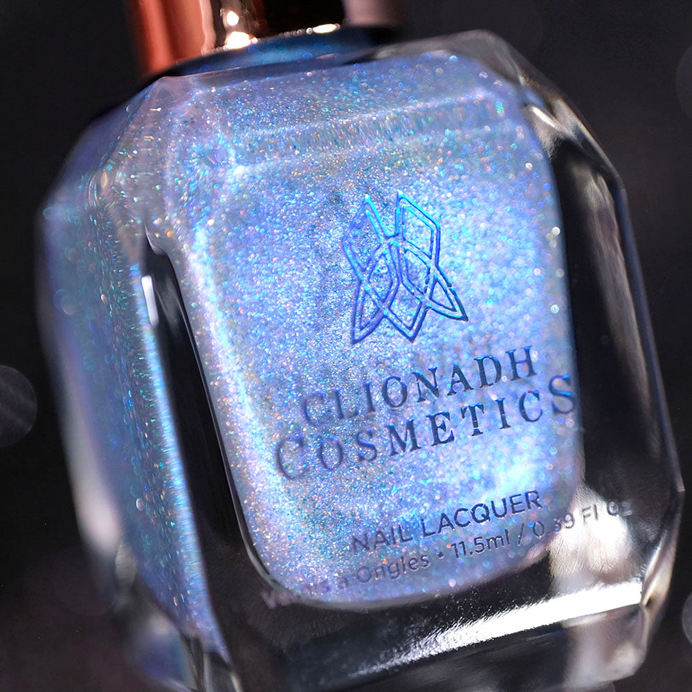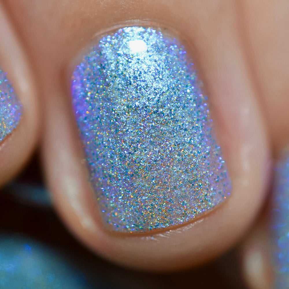 Mausoleum: A ghostly cobalt shimmer with linear holographic pigment and pale blue reflective glitter.