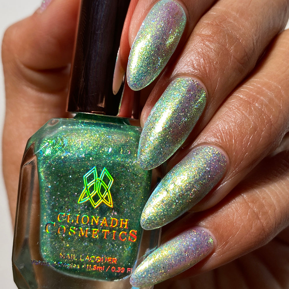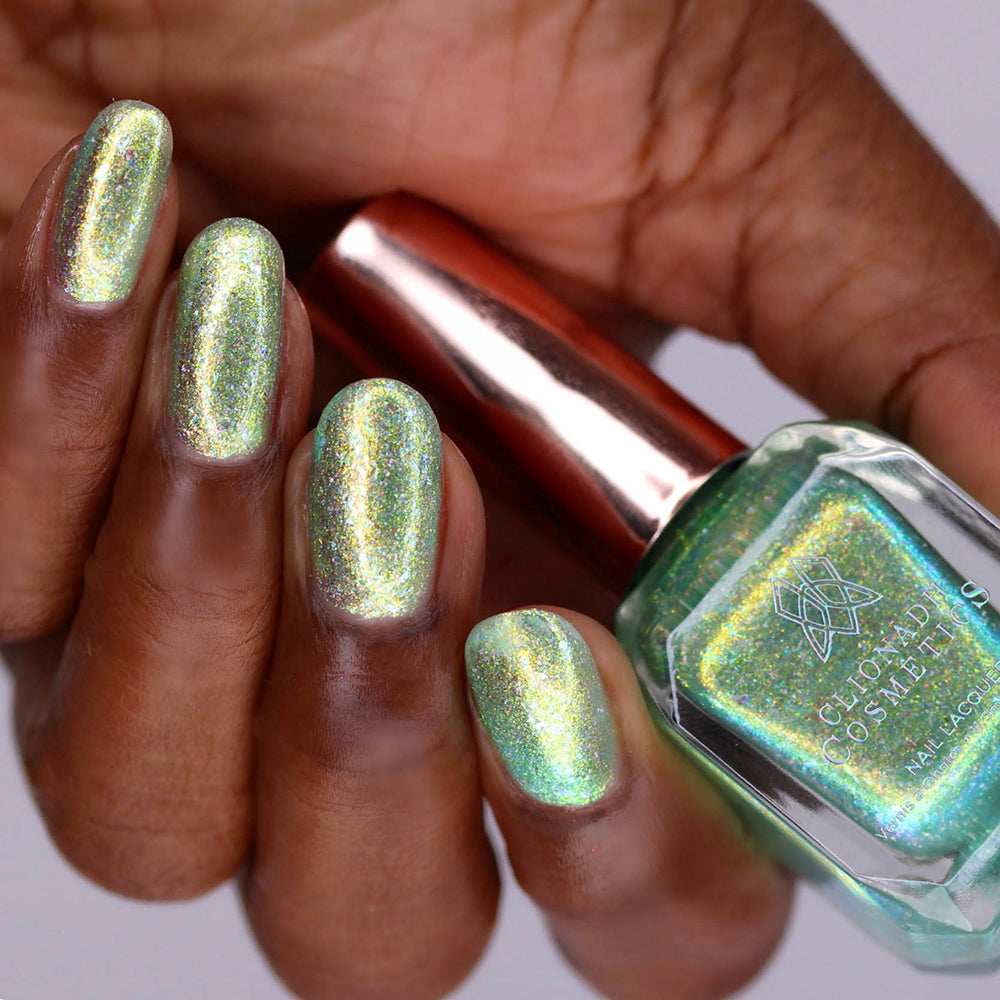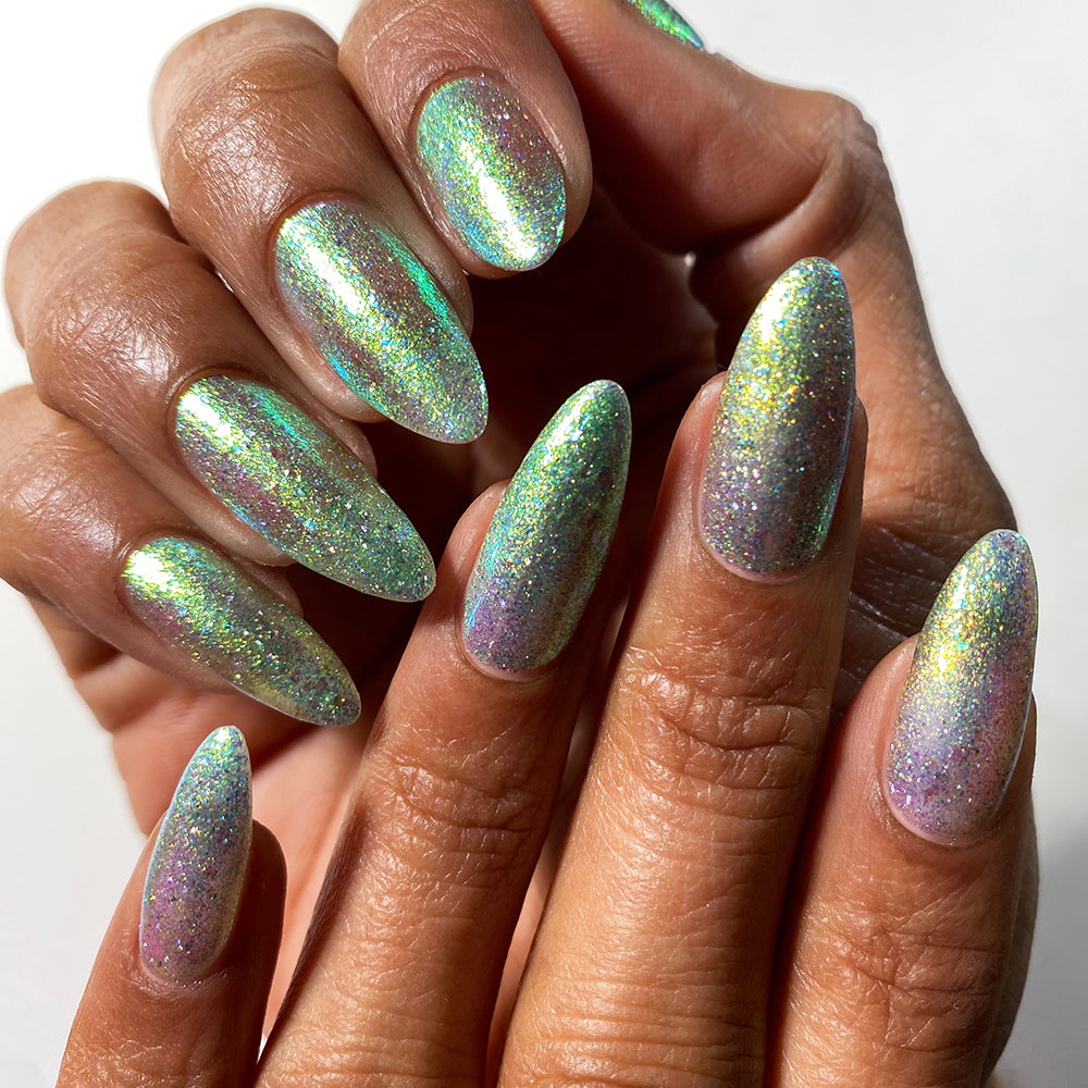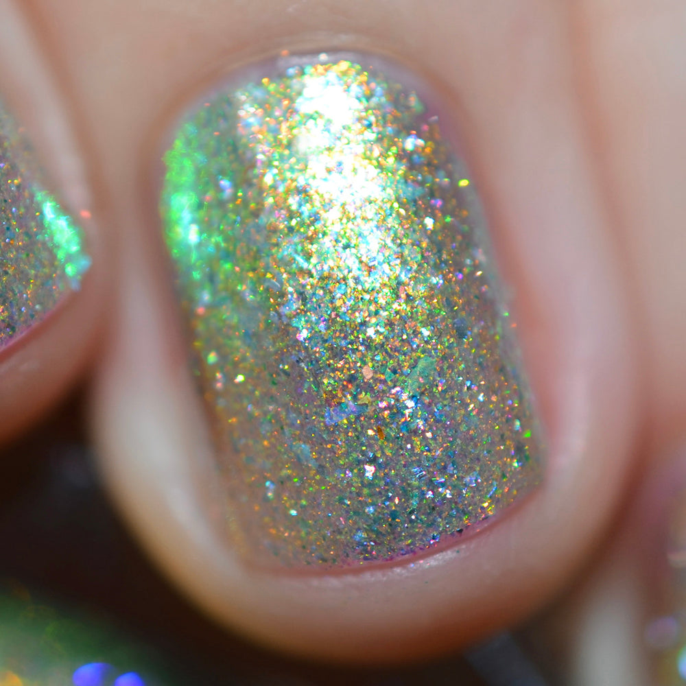 Ophelia: A pale gold-green-aqua shifting shimmer with aqua flakes and a splatter of silver holographic micro-flakes. Inspired by Millais' 1852 "Ophelia" painting depicting the eponymous Shakespearian character.