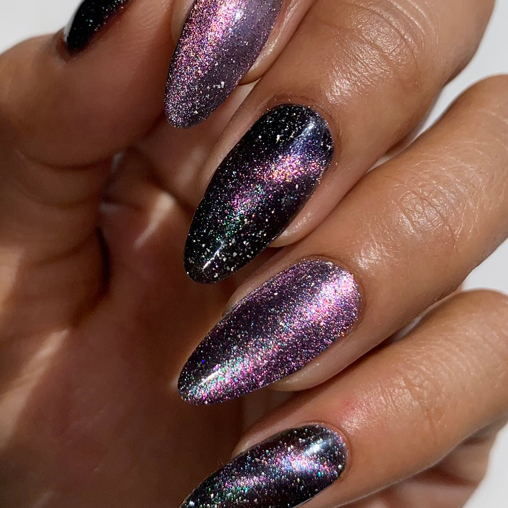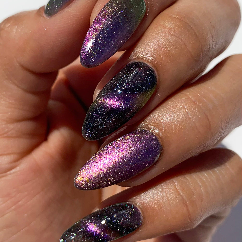 Best applied in 2 coats, then magnetize the third. Due to the interwoven, dual magnetic pull, we find the best way to enhance this effect is by magnetizing in the velvet style, or a "lazy gradient" by pushing the pigment away from half of your nail (in an orientation you desire such as towards the tip for a faux French magnetic manicure). Of course, a cat eye magnetization will look equally as beautiful and lend more towards a cosmic effect.