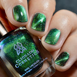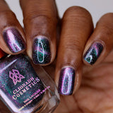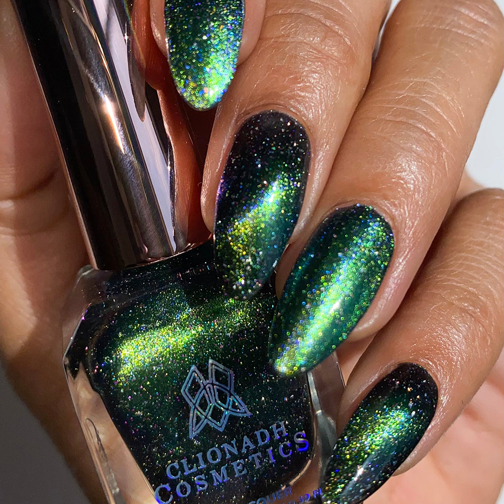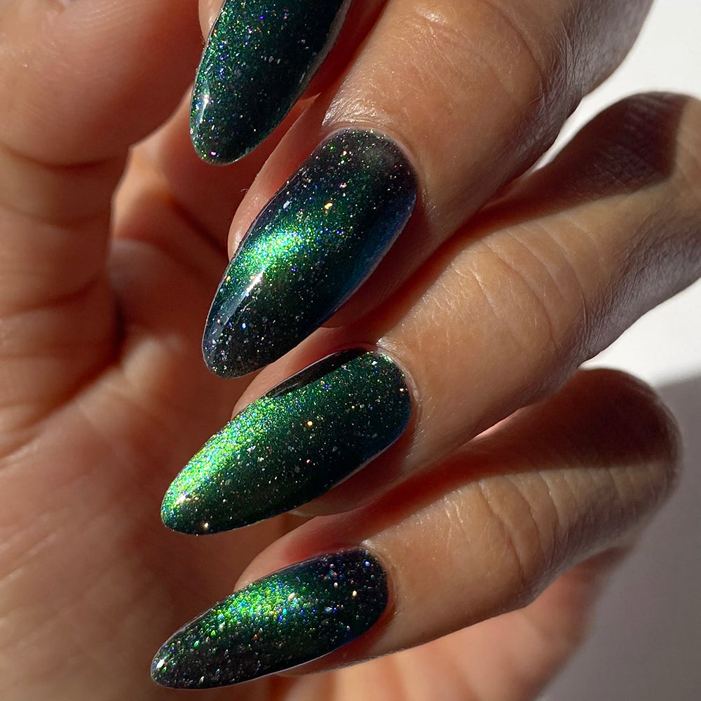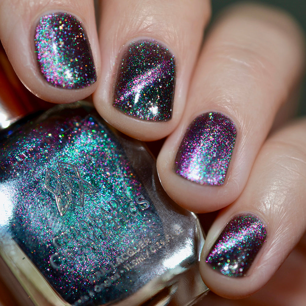 Planetary Attraction:  A cosmic magnetic nail lacquer with a subtle duality to its pull. This polish has interwoven shifts of grungy lime/teal and green/indigo that magnetize to reveal a static night sky scattered with reflective micro-glitter and holographic micro-flakes to create the ultimate dimensionality.