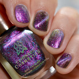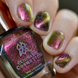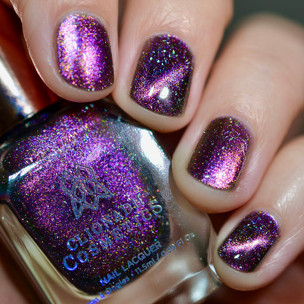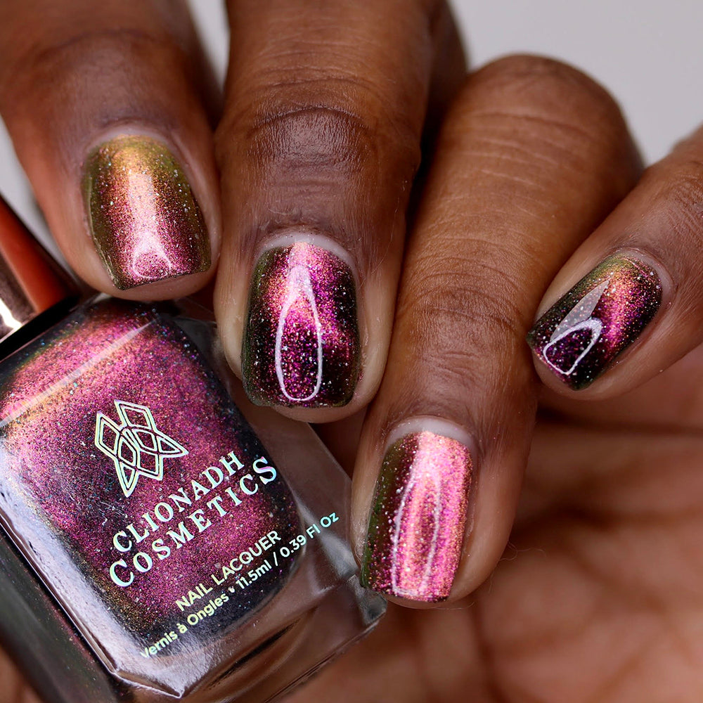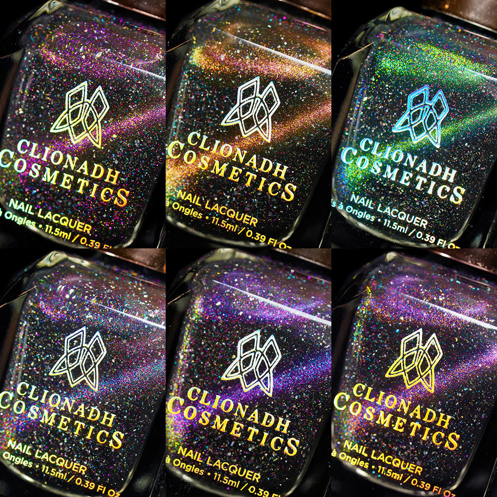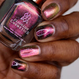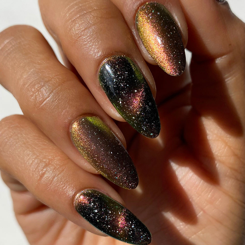 Solar Friction: A cosmic magnetic nail lacquer with a subtle duality to its pull. This polish has interwoven shifts of magenta/yellow and peach/green that magnetize to reveal a static night sky scattered with reflective micro-glitter and holographic micro-flakes to create the ultimate dimensionality.