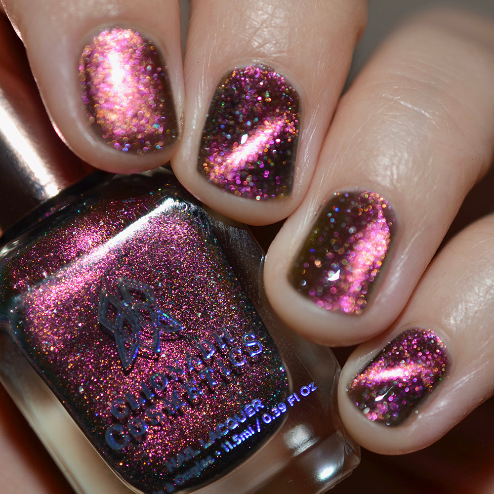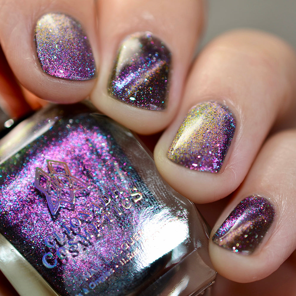Cosmic Cling: A cosmic magnetic nail lacquer with a duality to its pull. This polish has interwoven shifts of pink/yellow and blue/green that magnetize to reveal a static night sky scattered with reflective micro-glitter and holographic micro-flakes to create the ultimate dimensionality.