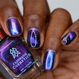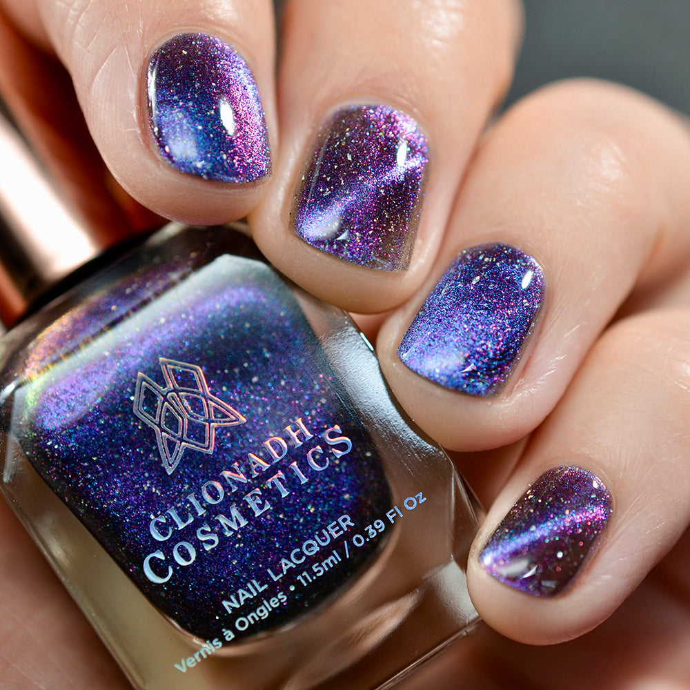 Polar Nebula: A cosmic magnetic nail lacquer with a duality to its pull. This polish has interwoven shifts of cobalt/pink and indigo/orange/lime that magnetize to reveal a static night sky scattered with reflective micro-glitter and holographic micro-flakes to create the ultimate dimensionality.