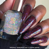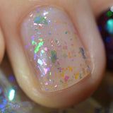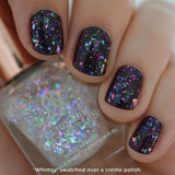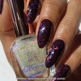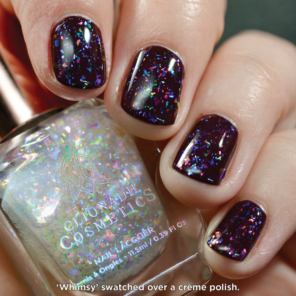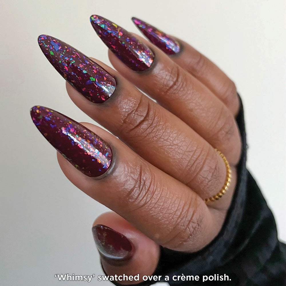 Whimsy: An iridescent topper with pink, cobalt and green flakes that collectively shift red, orange, yellow and violet.